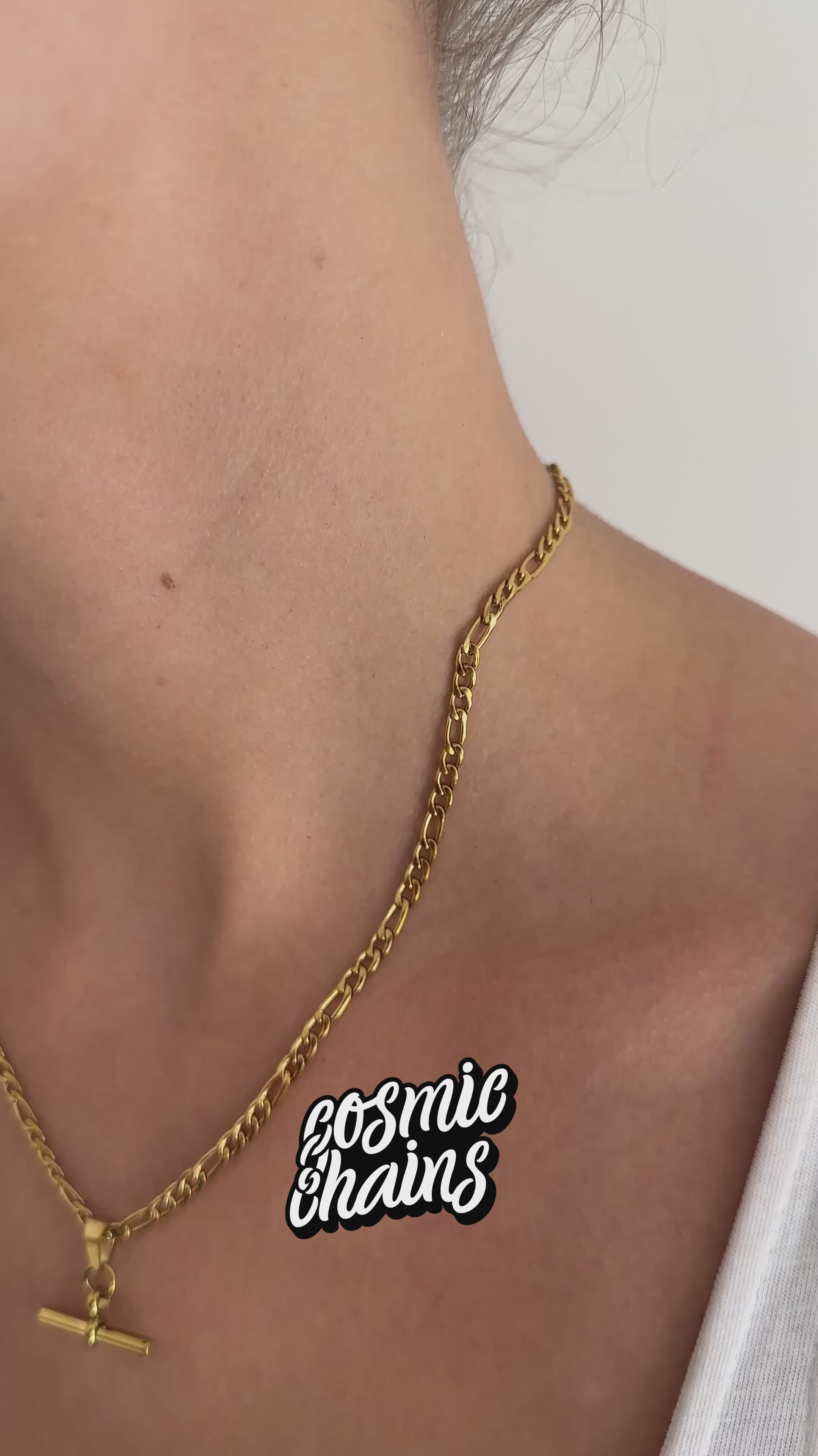 Introducing our Stainless Steel gold T Bar Necklace in Gold, a chic and versatile accessory designed to elevate your style with sophistication. Crafted from high-quality stainless steel, this necklace features a stunning T bar pendant suspended from a classic Figaro chain, offering a perfect blend of elegance and durability. This gold t bar necklace is perfect for stacking with other everyday necklaces.